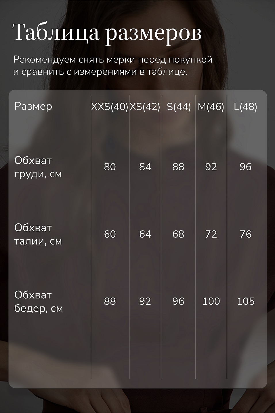 Параметры модели: Рост модели - 172 см. Обхват груди - 88 см. Обхват талии - 60 см. Обхват бедер - 90 см. Размер на модели - XS/40